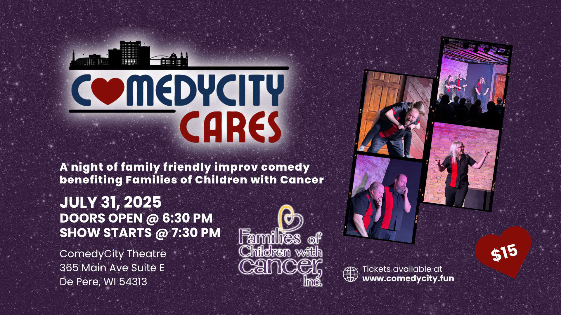 FOCWC is a local social support 501c3 non-profit organization for families who have had a child diagnosed with cancer in the Northeast WI and Michigan’s UP. FOCWC provides many resources to families such as financial assistance, care packages, medical binders, hospital bags and monthly activities/events for families to spend time together and get a break from the weight of treatment and illness. These support items and events are all at no cost to families, and funded through the group with the help of fundraising events such as the Comedy Show throughout the year. 100% of funds raised goes back to local families. Check out their website at www.focwc.org.